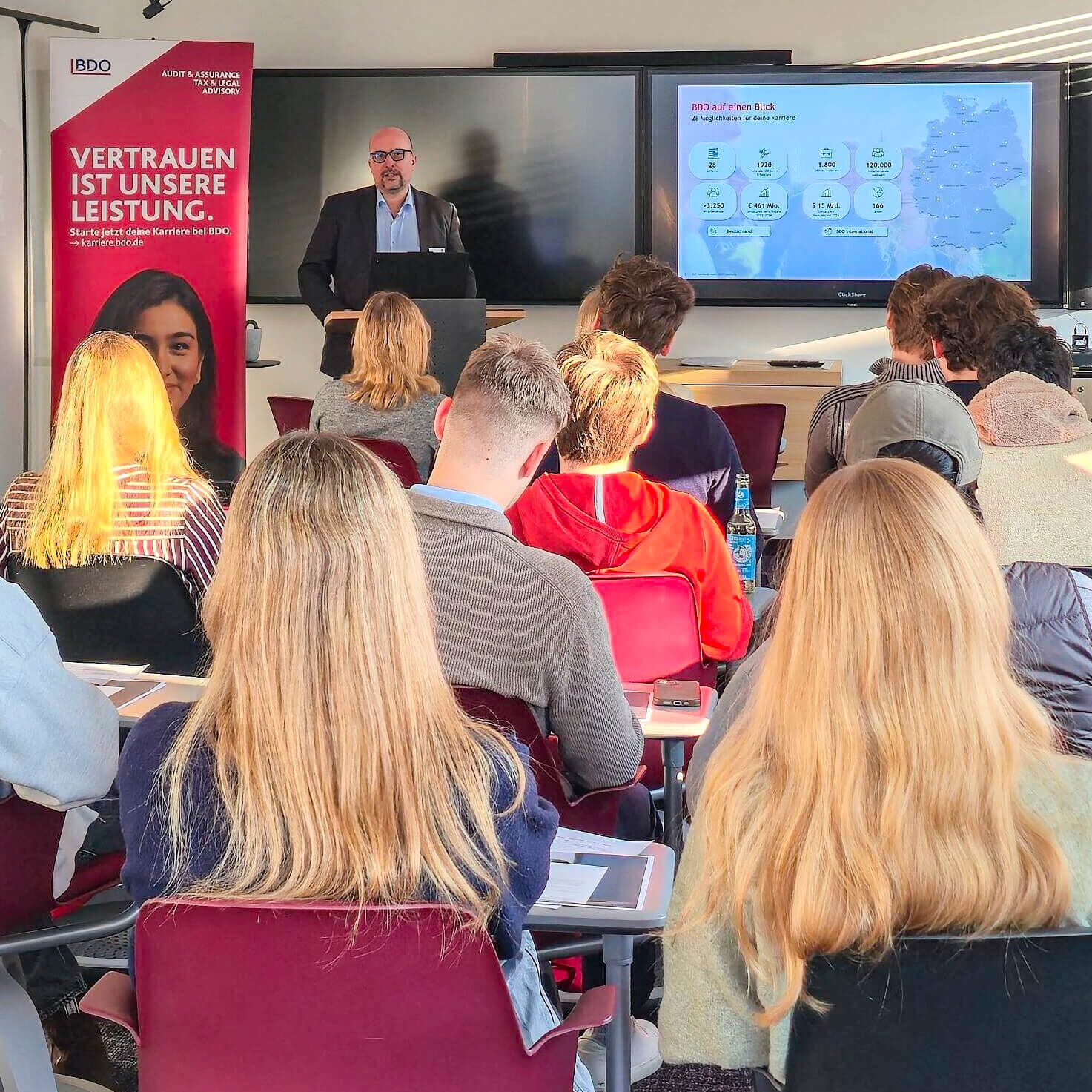 - Im Januar 2026 unternahm Prof. Dr. Franziska Kahla gemeinsam mit den Studierenden der Kurse IB WS24.1 und IB WS24.2 eine spannende Exkursion zur Wirtschaftsprüfungsgesellschaft BDO in Hamburg. Zwei intensive Workshop-Tage, 50 engagierte Studierende und jede Menge Praxis: