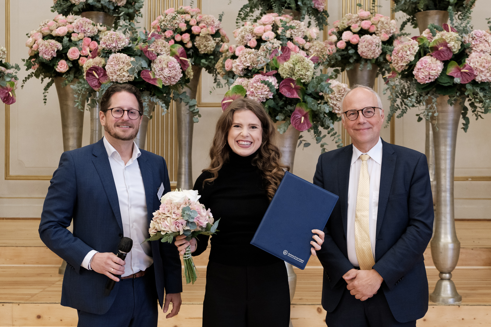 Der diesjährige Forschungspreis wurde Ende September 2022 an Josephine Messerschmidt, Absolventin des Masterstudiengangs Wirtschaftspsychologie, für ihre Arbeit »Bindung auf Distanz – Die ganzheitliche Home-Office-Einführung in Zeiten von Covid-19 und dessen Auswirkung auf die organisationale Bindung von Arbeitnehmern« vergeben. Prof. Dr. Herbert Fitzek, Prorektor für Forschung und Interdisziplinarität, und Prof. Dr. Rainer Zeichhardt, Prorektor für Lehre und Qualität, überreichten der Absolventin feierlich die Urkunde.