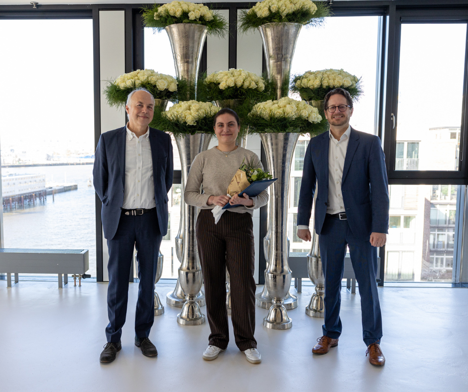 Der Forschungspreis 2023 wurde am 28. März an Julie Jacquemin, Absolventin des Masterstudiengangs Wirtschaftspsychologie am Campus Hamburg, für ihre Arbeit »Eine tiefenpsychologische Untersuchung zum Wandel der Begrüßungsformen in Zeiten von Corona« vergeben. Prof. Dr. Herbert Fitzek, Prorektor für Forschung und Interdisziplinarität, und Prof. Dr. Rainer Zeichhardt, Prorektor für Lehre und Qualität, überreichten der Absolventin feierlich die Urkunde.