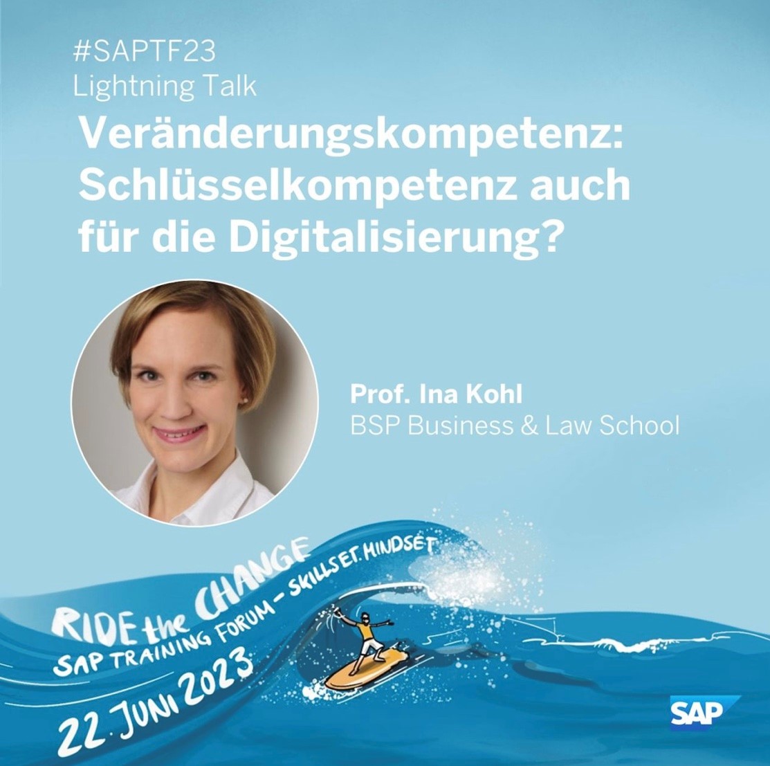 Im Rahmen der Veranstaltung „Ride the Change – Skillset.Mindset“ am 22. Juni hat Prof. Dr. Ina Kohl einen Impulsvortrag zum Thema „Veränderungskompetenz – Schlüsselkompetenz auch für die Digitalisierung?“ gehalten. Die Veranstaltung mit rund 500 angemeldeten Teilnehmenden ist ein Highlight in der SAP Training und Change Community.